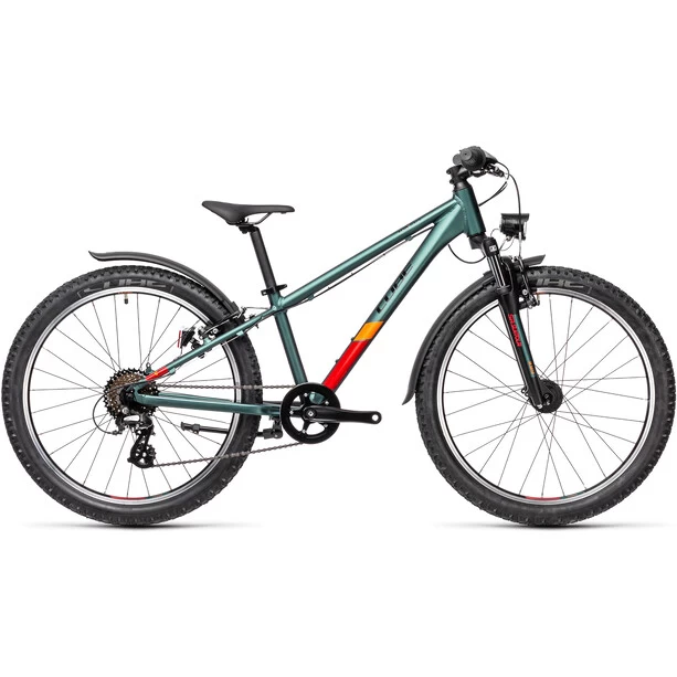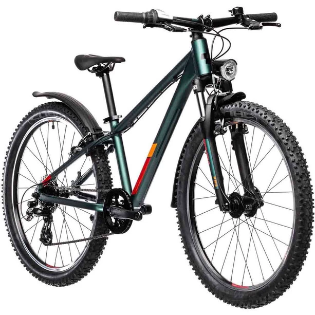 CUBE meint, es macht wenig Sinn, wenn Eltern das gerade gekaufte Fahrrad für ihre Kids erstmal straßentauglich machen müssen. Deshalb bietet CUBE mit dem Acid 240 Allroad ein Modell an, das alles kann – und alles hat. Also diverses Zubehör, das man im Alltag oft braucht: Schutzbleche für schlechtes Wetter (und saubere Klamotten), ein LED Lichtsystem zum „Sehen und gesehen werden“, ein Power Modulator am Vorderrad, der allzu heftiges oder aprubtes Bremsen reguliert, damit die Kids keinen unfreiwiligen Abflug über den Lenker machen, und ein Seitenständer, damit man das Bike nicht mehr an Bäumen, Parkbänken oder Hauswänden anlehnen muss. Als Performance Finish hat CUBE eine Suntour Federgabel verbaut, die Bodenunebenheiten auf ruppigem Untergrund gekonnt ausradiert, und eine breit gefächterte 7-Gang Schaltung, die leicht und geschmeidig von Gang zu Gang wechselt. Super!