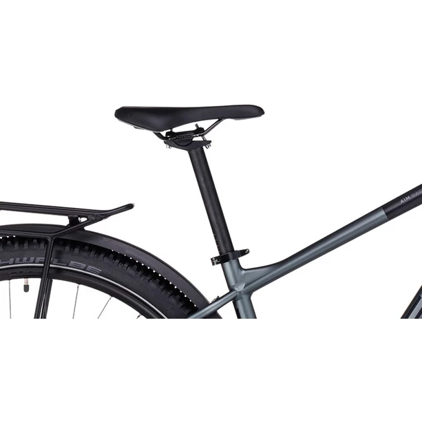 Der Aim Allroad Rahmen setzt in Sachen Vielseitigkeit neue Maßstäbe. Er kommt inklusive Schutzbleche, Gepäckträger und Lichtanlage daher, sodass du direkt aufsitzen und losradeln kannst. Außerdem wurde ihm ein geschraubtes Tretlager gegeben und die Züge ins Innere verlegt, damit sie ihre Aufgabe lange machen und leicht gewartet werden können. Die Aufnahme für eine Flat Mount Scheibenbremse ist nahtlos in die Seitenständeraufnahme integriert. Die überarbeitete Geometrie hat ein niedrigeres Oberrohr für noch zuverlässigeres Handling und lässt viel Platz für breite, griffige, komfortabel rollende 2.25 Zoll Reifen. Außerdem wurde auch das SizeSplit System jetzt noch breiter aufgestellt – dadurch findest du mit Sicherheit die perfekt passende Kombination aus Aim Laufrad- und Rahmengröße für dich.