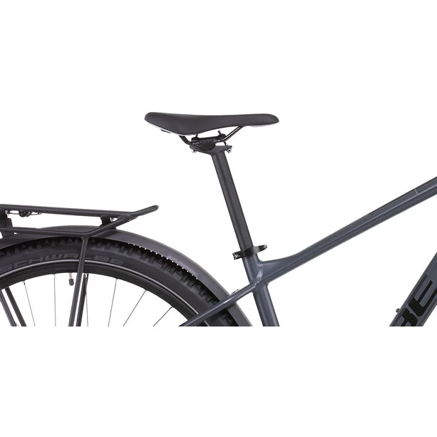 Der brandneue Aim Allroad wurde für 2022 komplett überarbeitet und setzt neue Maßstäbe in Sachen Vielseitigkeit. Er kommt inklusive Schutzbleche, Gepäckträger und Lichtanlage daher, sodass man direkt aufsitzen und losradeln kann. Außerdem hat Cube ihm ein geschraubtes Tretlager gegeben und die Züge ins Innere verlegt, damit sie ihre Aufgabe lange machen und leicht gewartet werden können. Die Aufnahme für eine Flat-Mount-Scheibenbremse ist nahtlos in die Seitenständeraufnahme integriert. Die überarbeitete Geometrie hat ein niedrigeres Oberrohr für noch zuverlässigeres Handling und lässt viel Platz für breite, griffige, komfortabel rollende 2.25 Zoll Reifen. Auch haben sie das SizeSplit System jetzt breiter aufgestellt – dadurch findet jeder und jede die perfekt passende Aim Allroad Rahmengröße für sich.
