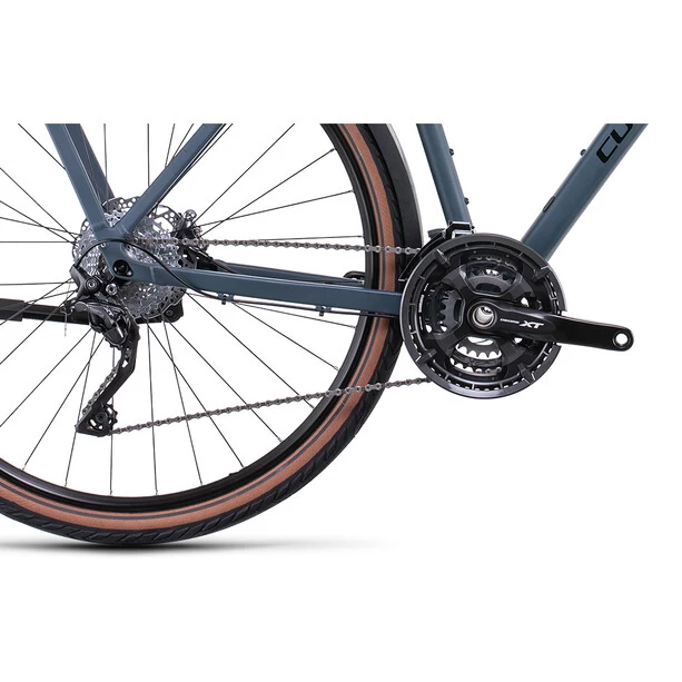 Cube hat den Kathmandu Rahmen für die Saison 2022 komplett überarbeitet. Er vereint sämtliche Highlights des Vorgängermodells, setzt aber noch eins obendrauf. Beispielsweise geht der überarbeitete integrierte Gepäckträger 3.0 nahtlos und formschön in das Acid Schutzbleche über. Dazu gibt’s am Hinterrad eine Aufnahme für eine Flat-Mount-Scheibenbremse und einen Seitenständer. Seine cleane, aufgeräumte Optik verdankt das Chassis den im Smooth Welding Verfahren geschweißten Sitz- und Steuerrohrverbindungen. Doch das ist noch lange nicht alles: Cube hat den Hinterbau mit einer Steckachse aufgerüstet und ihm ein konfiziertes Steuerrohr für optimierte Stabilität und Lenkpräzision (selbst bei voller Beladung) gegeben. Und dank innen verlaufender Züge schaltet das Bike dauerhaft geschmeidig von Gang zu Gang und es verlängern sich die Wartungsintervalle. Cube hat an alles gedacht – nur die Zahnbürste, die muss man wohl selbst einpacken. Das Maß der Dinge in Sachen einfache Bedienung und zuverlässige Performance sind die Shimano XT Komponenten. Und dank der komfortablen, einfach verstellbaren Suntour NCX E RL Luftfedergabel wird jede noch so lange Tour ein echter Hochgenuss. Den letzten Schliff geben dem Bike der überarbeitete integrierte Gepäckträger 3.0, Schutzbleche, Lichter und ein Seitenständer. Fazit: Dies ist der neue Goldstandard für umweltbewusste Mobilität ohne CO2.