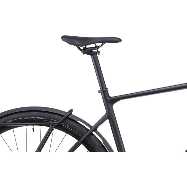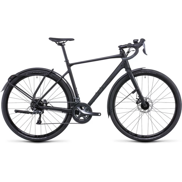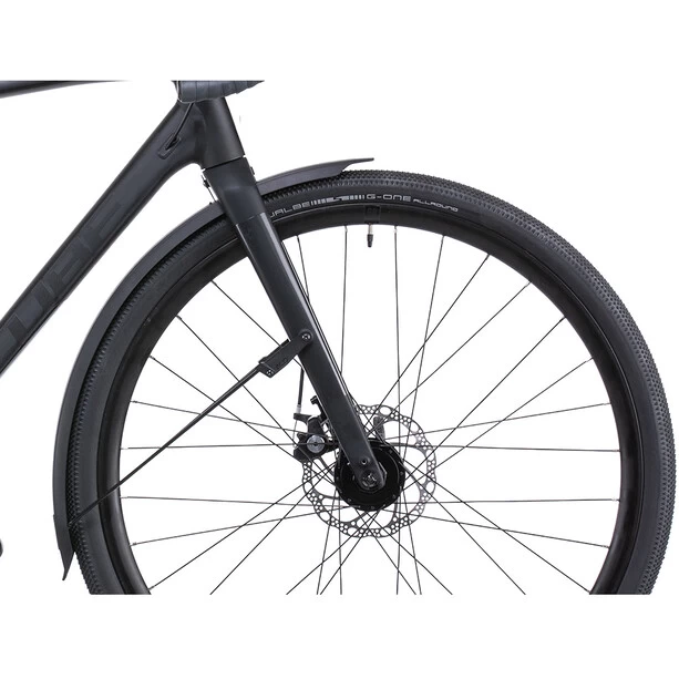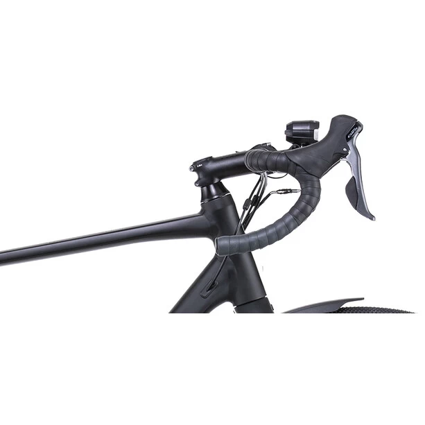 Bei der Entwicklung des Nuroad FE hat Cube sich von ihren Renn- und Cyclocross-Rädern inspirieren lassen und dem Rahmen zudem ein paar Mountainbike-Skills mit auf den Weg gegeben. Er bietet viel Reifenfreiheit für griffige und komfortabel rollende 40 mm breite Pneus, sogar mit den langen mitgelieferten Schutzblechen. Was noch? Einen überaus formschön integrierten Gepäckträger über dem Hinterrad, einen Seitenständer und eine komplette Lichtanlage. ästhetisch ins Innere verlegte Züge sorgen für dauerhaft saubere Schaltvorgänge, sogar bei viel Staub oder Matsch auf der Strecke. Praktisch für Transport und Lagerung: Die Laufräder mit Schnellspannern können ganz einfach und schnell ein- und ausgeklickt werden. Und die Vollcarbongabel ist nicht nur sehr leicht; sie absorbiert auch Vibrationen vom Untergrund und ist mit Aufnahmen für Lowrider-Gepäckträger versehen.