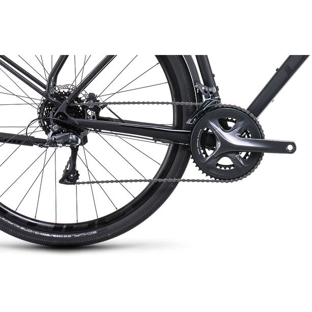 Mit dem Zweirad kommt man (fast) überall hin – das gilt vor allem für das vielseitige Nuroad FE. Es ist standardmäßig mit langen Schutzblechen, einem Gepäckträger, einem praktischen Seitenständer und einem Beleuchtungssystem für top Sicherheit auf den Straßen ausgestattet. Und wer noch mehr Lastenkapazität braucht, wird sich über die Montagepunkte für Lowrider-Gepäckträger an der leichten Vollcarbongabel freuen. Volle Kontrolle, selbst bei Nässe, vermitteln die leistungsstarken Scheibenbremsen im Team mit den breiten, komfortabel rollenden Reifen. Die zuverlässige Shimano 2×8-fach Schaltung hat für jede Situation und Anforderung den passenden Gang im Angebot, ganz einfach per Fingerzeig. Fazit: Egal wohin die Reise geht, das Nuroad FE ist startklar!