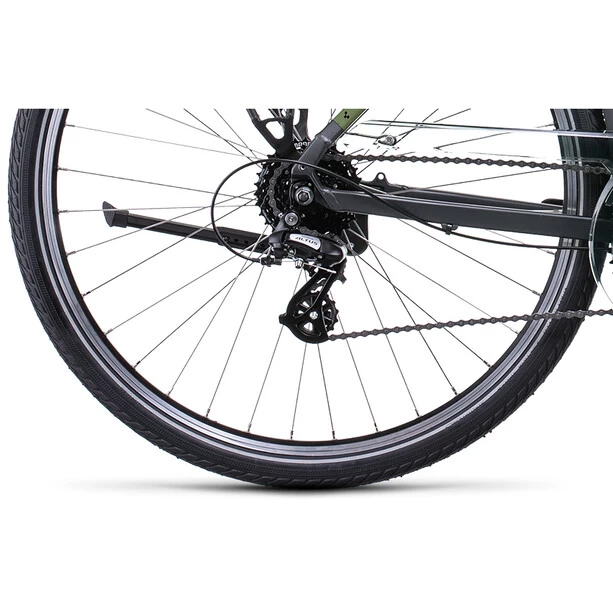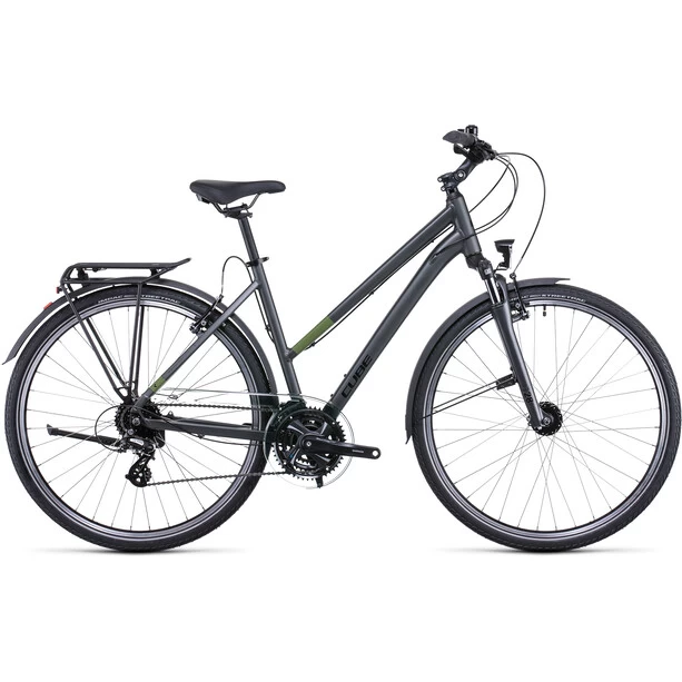 Egal, wohin die Reise geht – das Cube Touring erfüllt sämtliche Ansprüche in Sachen Fahrkomfort, Vielseitigkeit, Sicherheit und Fahrspaß mit links. Dank der bewährten Efficient Comfort Geometry und der geschmeidig arbeitenden Suntour Federgabel lässt sich dieses Bike selbst von den löchrigsten Schotterwegen nicht beeindrucken. Cube hat außerdem jede Menge praktisches Zubehör verbaut, zum Beispiel einen ästhetisch integrierten Gepäckträger, lange Schutzbleche, eine dynamobetriebene Lichtanlage und einen Seitenständer. Damit ist man für alle Eventualitäten optimal gerüstet. Und das Gängewechseln geht dank der 3×8-Schaltung von Shimano ebenso einfach wie das sichere Bremsen mit den leichten, aber kraftvoll zupackenden Felgenbremsen. Selbstverständlich hat das Rad den strengen hauseigenen Sicherheits- und Härtetests mit Bravour bestanden.
