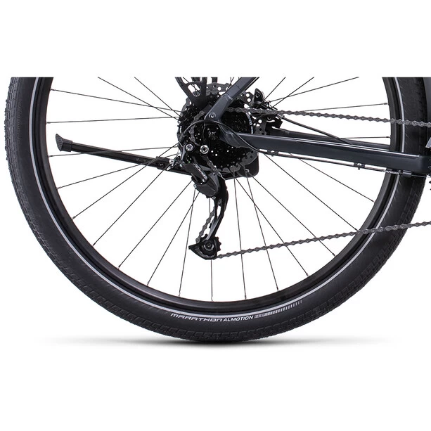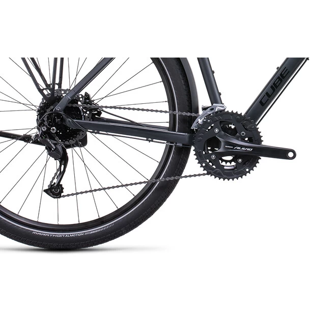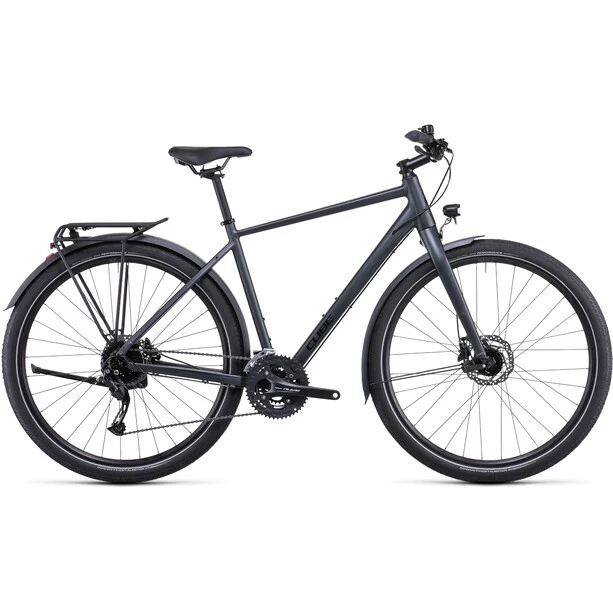 Wer sich für ein Cube Travel entscheidet, bucht das Abenteuer gleich kostenlos mit, weil dieses Bike alles mitbringt, was es auf Entdeckertour braucht: semi-integrierter Gepäckträger, extralange Schutzbleche, Seitenständer und eine per Dynamo am Vorderrad betriebene Lichtanlage. Mit der einfach bedienbaren, breit gefächerten Shimano Alivio 3×9-fach Schaltung wechselt man spielend leicht von Gang zu Gang und meistert jede Route und jeden Anstieg souverän. Wetterunabhängig sicheres Bremsen ist das Spezialgebiet der leistungsstarken hydraulischen Shimano Scheibenbremsen. Bleibt die Frage, wo der nächste Trip hingeht.