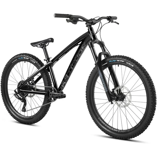 Bei der Ausstattung wurde besonders auf Haltbarkeit geachtet. Die Rock Shox Silver R Federgabel mit 130 mm Federweg schluckt Wurzeln, Steine und Sprünge ohne Weiteres weg. Dank der hydraulischen Sram Level Scheibenbremse musst du dir nie Sorgen machen, wenn du das Tempo stehen lässt. Die 26 Zoll Laufräder von Dartmoor sind stabil, zirkeln leicht um Kurven und sind auf Pumptracks und Dirt Strecken schnell zu beschleunigen. Das Cockpit mit breitem Lenker und kompaktem Viper Vorbau gewährleistet ein exaktes Handling.