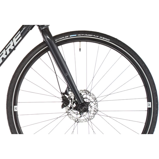 Das Shaper 3.0 ist mit einer kompletten Shimano Acera-Neunfach-Gruppe ausgestattet, die auch nach tausenden von Schaltvorgängen zuverlässig und wartungsarm schaltet. Dank des Dreifachkettenblatts und der breitgefächerten Kassette hast du genügend Gänge, um auch mit schweren Packtaschen jeden Berg zu bewältigen. Die schnell ansprechenden hydraulischen Scheibenbremsen von Shimano lassen sich leicht bedienen und bremsen genau dann, wenn du es willst – wichtig für den Einsatz auf belebten Straßen in der Stadt. Die robusten, großzügig dimensionierten Schwalbe-Reifen bieten bei jedem Wetter großartigen Grip und sind praktisch unempfindlich gegen Pannen – etwas, für das du ewig dankbar sein wirst, besonders wenn du das Rad zum Pendeln nutzt.