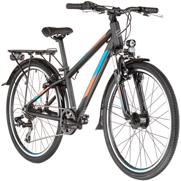 Der leichte Alurahmen hat nicht nur eine robuste Ausstattung, sondern durch das stark abfallende Oberrohr auch eine sehr kindgerechte Geometrie die ein sicheres Handling des Rockvilles ermöglichen. Beim Rockville Street überzeugt die Vollausstattung inklusive Schutzbleche, Gepäckträger und Lichtanlage mit Shimano Nabendynamo.